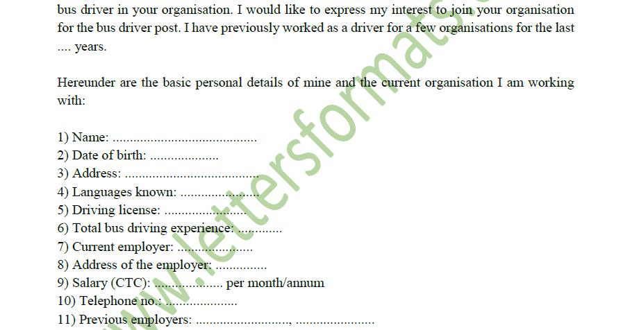 Sample job application to apply for driving job as car driver, bus driver, truck driver, traller driver, tractor, or any driving job position in with due respect, i am writing this letter to apply for the bus driver job. Check out this post to get free job application samples and when applying for a job, you should always prepare a job application letter to be submitted together with your updated resume. Job application letter are prepared by individuals to apply for a job. Brilliant example job application letters you can use when applying for any job! This is one of the.